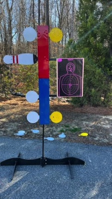 All Steel System, Able to change positions and rotate during live fire for moving targets. Comes with Standard Plates. All plates and system is powder coated. As the system is used, paint will chip off. We recommend touching up with a spray paint of your choice. 6 week lead time. Offset Weights for balancing are an option for$40 extra. Free Shippimg.